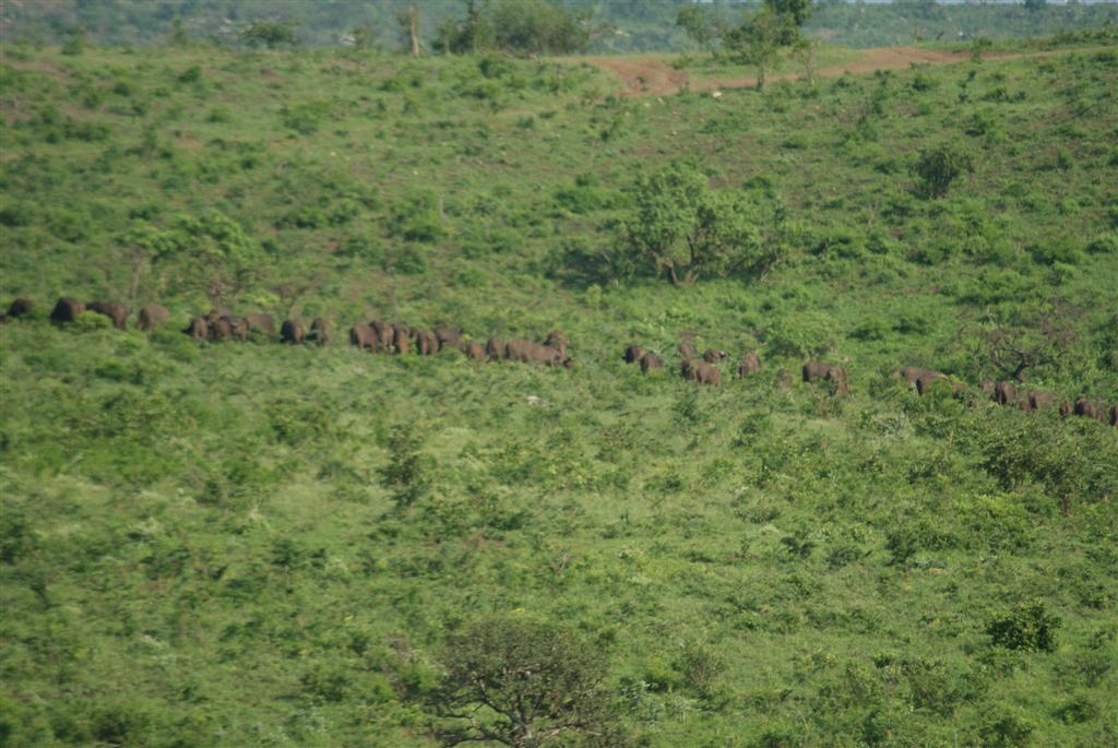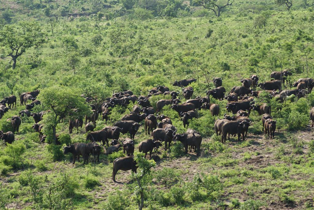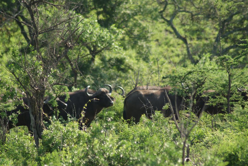 We were doing really well for animal sightings and we hadn’t even had breakfast yet. Steve drove to the top of the track where we were all allowed to get out and stretch our legs while he laid out a breakfast for us on the little drop down shelf on the back of the jeep. We had yogurt and cereal, fruit, muffins, rusks and tea or coffee while we were busy looking out on the surrounding area. The buffalo heard were getting closer. My camera was in the jeep but suddenly we turned round and we were being stared at by several hundred buffalo no more than 50 meters away from us. Steve wanted us to quietly and slowly get back in the jeep, just in case, but fortunately they crossed the path and went down the other side of the hill and melted into the undergrowth.