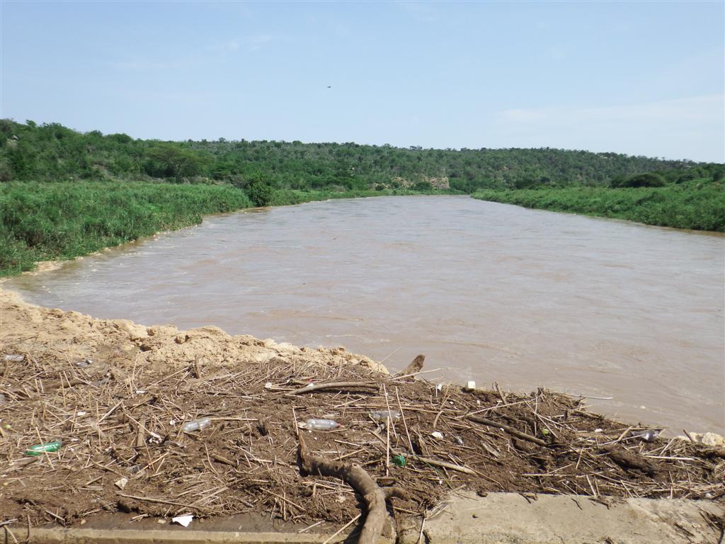 Steve packed up the picnic and we continued on our journey. After returning to the main road our journey took us over the Black Umfolozi river which was very swollen after the rains of the previous couple of days. A lot of debris had floated down the river and was caught up by the bridge. The water was only a few inches below the bridge. Once on the other side the scenery flattened out a bit and many of the smaller trees had been bent over and snapped as though a storm had gone through.