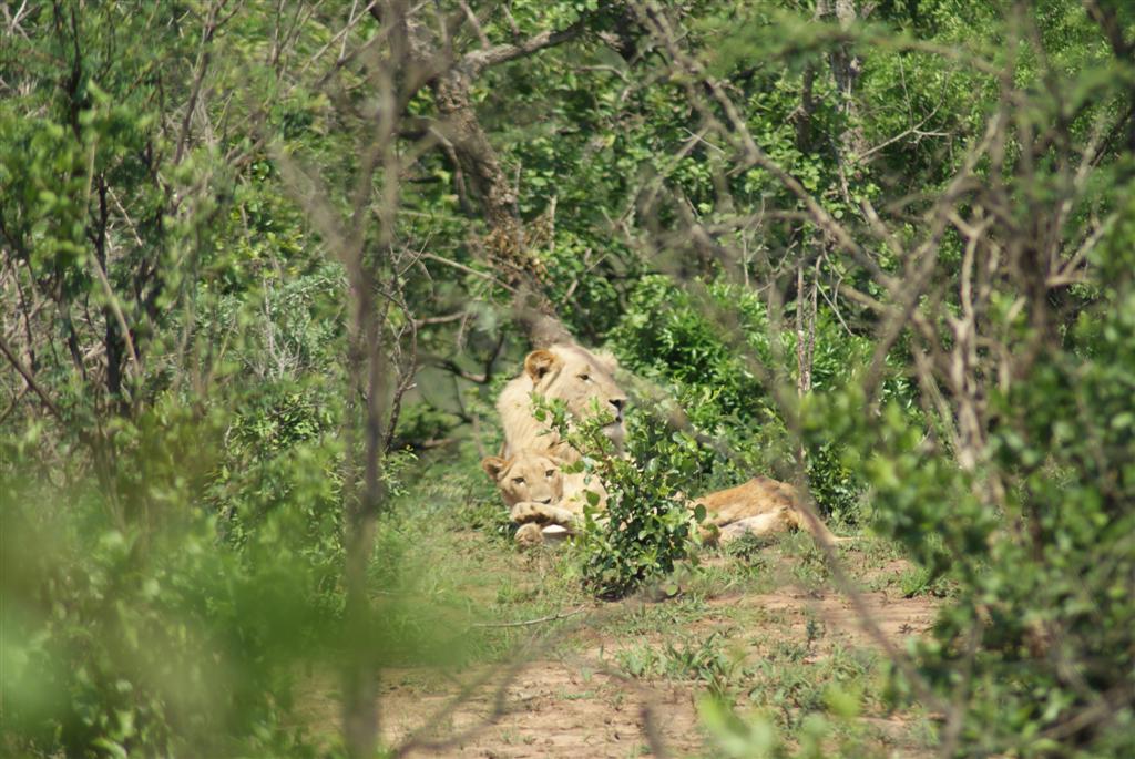 We drove for about an hour without any sightings then suddenly Steve stopped the jeep and started reversing. ‘What’s he seen’ we were all thinking. Steve said to look through the bush to see what we could see. It was a lion – A REAL LION our 4th Big 5. A wonderfully handsome male lion. How Steve saw it from the cab I don’t know but that’s why we had paid for a guide. We watched him for a while through the bush then realised there were two of them.