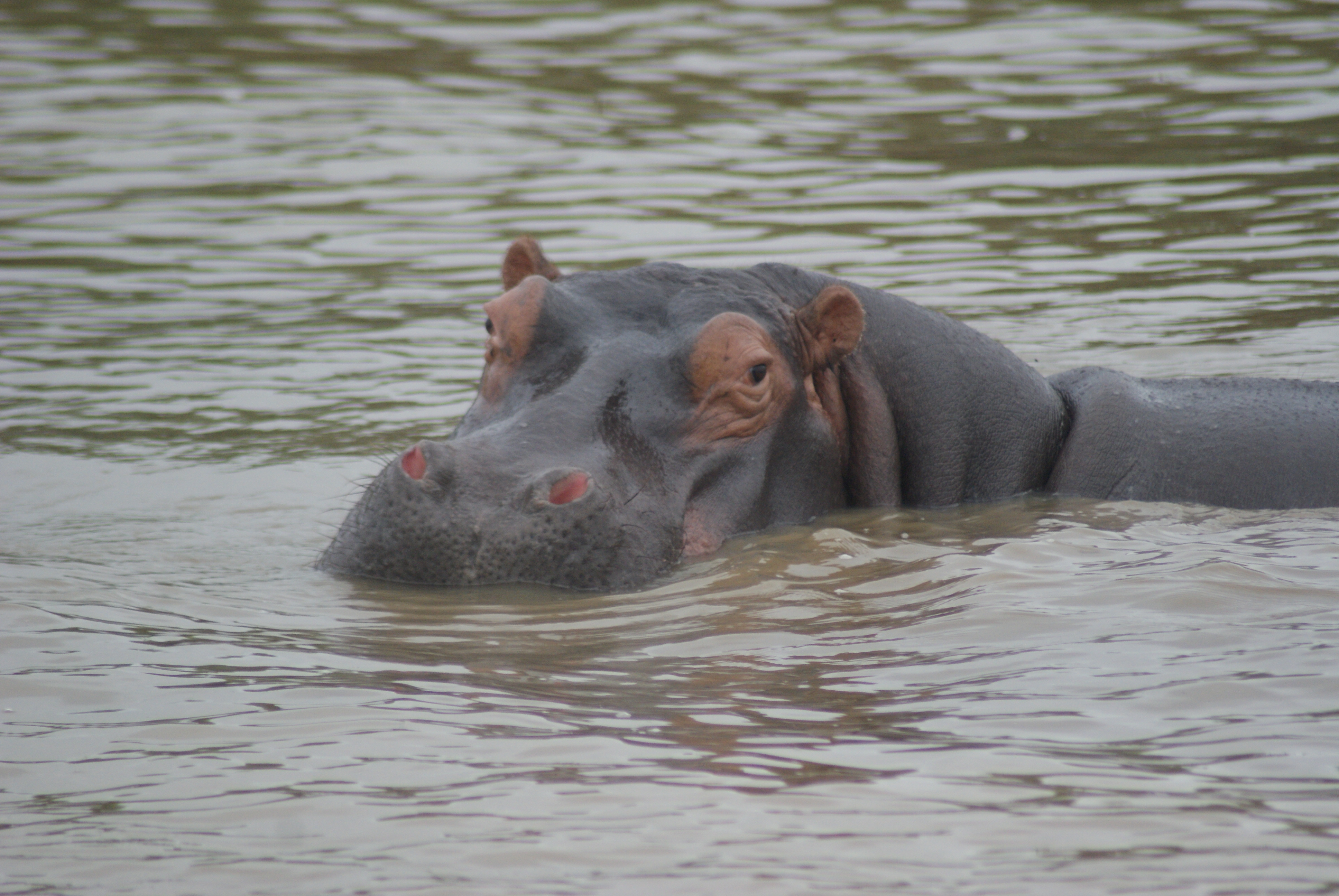 Although Monzi do safaris we had booked our safari with Eurozulu who had their offices next door. Earlier we had visited them to pick up our safari tickets plus our tickets for the 2 hour hippo and croc that was booked for 4pm. This would normally be a good time because as the sun goes down it shows the colours of the hippos nicely – the problem was there wasn’t any sunshine and it was still raining. It would have been a nice walk from Monzi to the sunset jetty but it wouldn’t have been very nice sitting soaking wet so we drove the short distance to the jetty. Once there we were shown to one of four boats waiting for its passengers. Our friends Antony and Davina were already aboard. We set off north along the St Lucia estuary. At first I didn’t think we were going to see anything but then the hippos started bobbing up and appearing all around us.