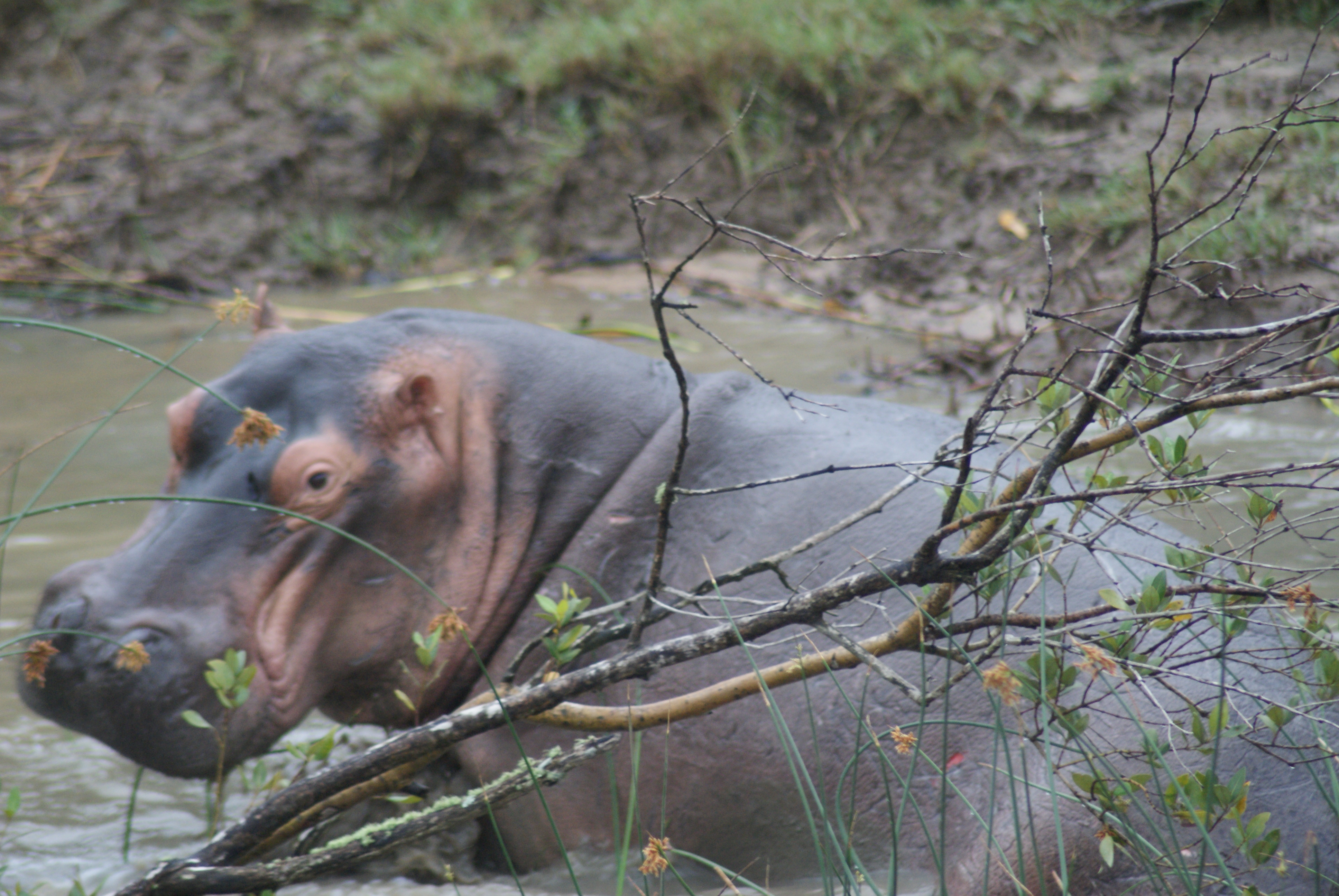 Further up the river the land flattened out and a couple of the hippos had got out of the water to stretch their legs. It was fairly swampy but there was a bit of grass for them to graze on. The rain had been drizzling on and off but it didn’t seem to matter to the hippos they were enjoying the mud. After an hour or so our boat turned round and motored back to the jetty. We didn’t see any crocs on the tour because it was mating season and they were all in the swamps further north. Once along side we returned to our hut to get ready for our safari the next day.