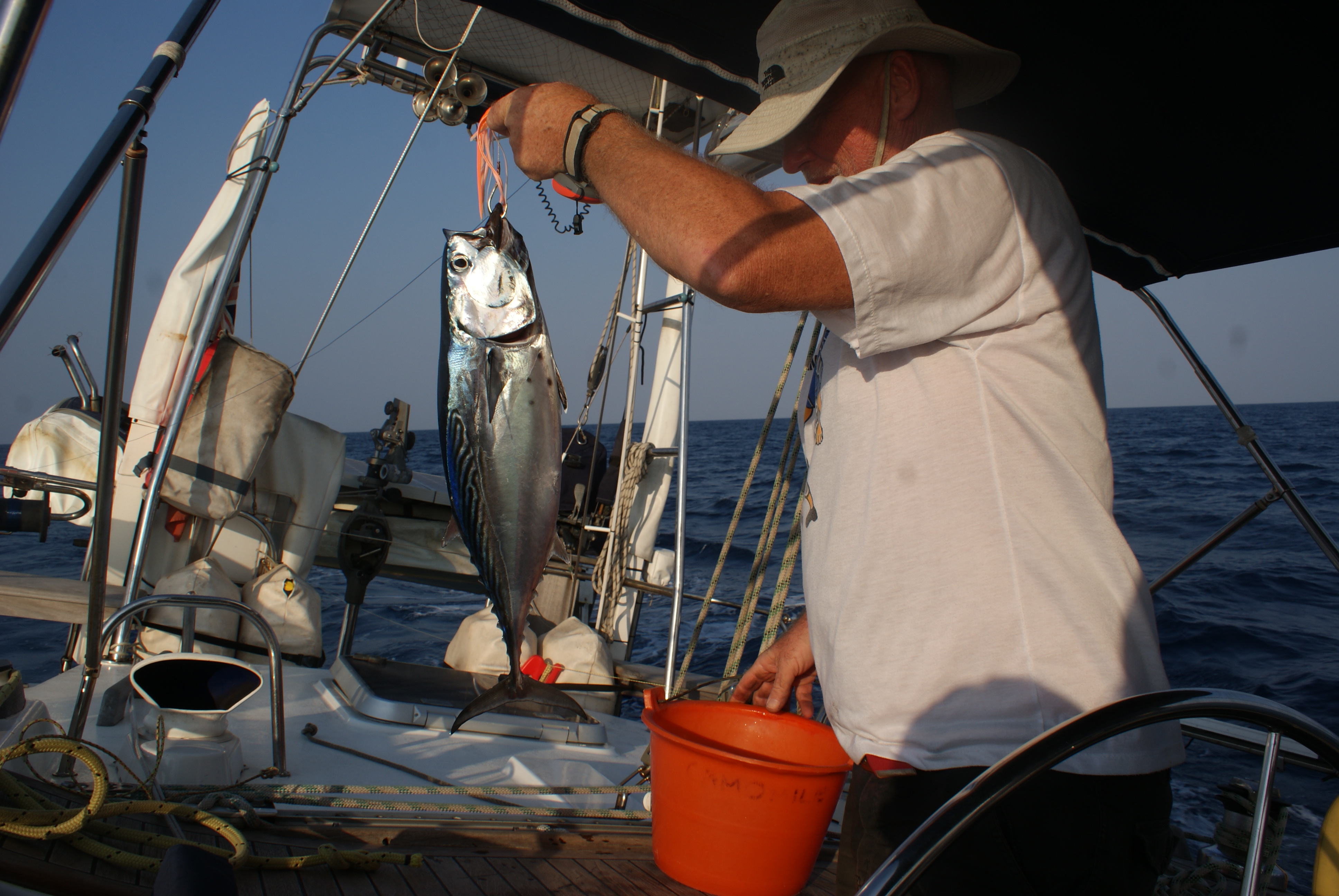 The good news, WE CAUGHT A FISH. In fact we caught 2 as we had 2 lines out. One got away along with one of Bill’s best lures but we landed the other one. The first fish we’ve caught this side of Australia so that’s over 3 years. It was a blue fin tuna and I managed to cut 4 nice fillets off of it. They turned out quite expensive though because as Bill was reeling in the trolling line the plastic handle, which has sat out in the sun for the last seven years, broke. I handed him the gaff which had been stored under the solar panel but had obviously rotted and broke and fell in the water when he tried to lift the fish with it. It was gutted using my scissors but they were accidentally thrown over the side with the contents of the bucket full of guts. Not sure if we are going to bother again!