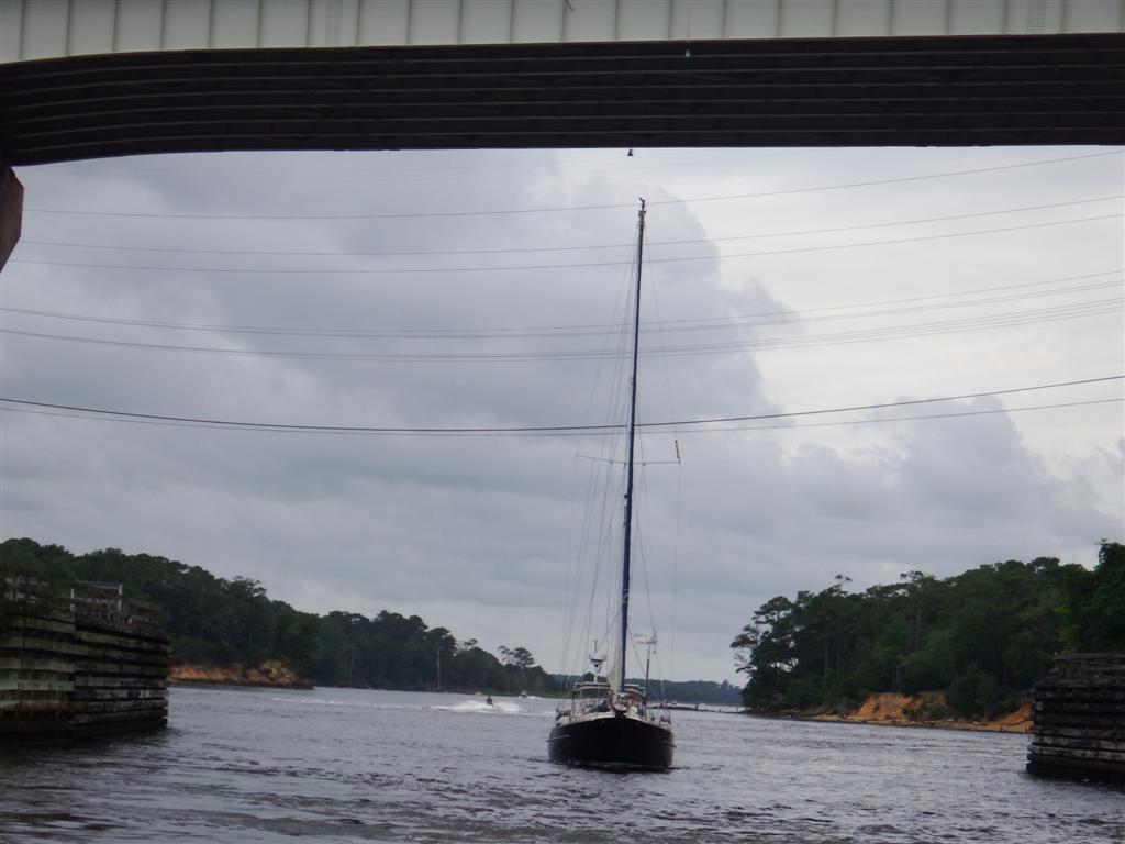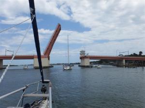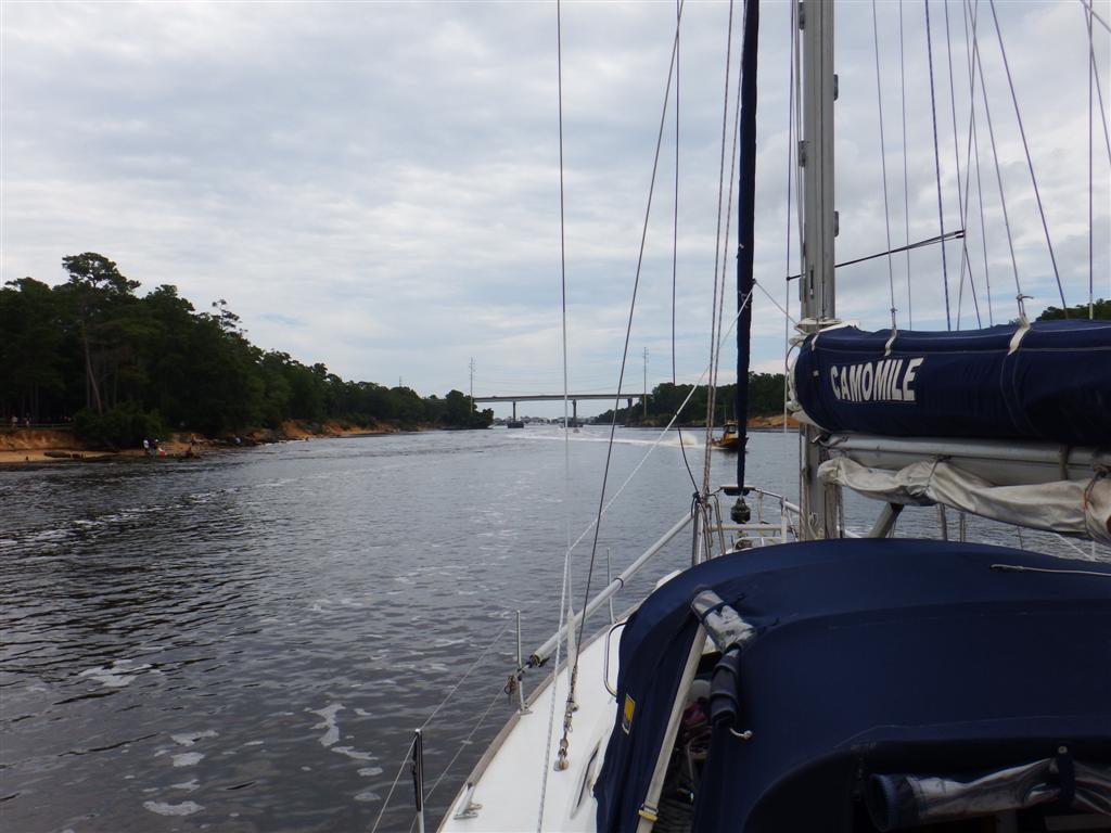 There had been no wind and we’d motored all the way. In the ICW all the fixed bridges 64ft, give or take a foot depending on the tide, if they are less than that they open. Some will open on demand, some have timetables but ask the bridge operator. The depth in the ICW in the channel is supposed to be about 10ft but Camomile draws 2 metres or 6 feet and has touched the bottom a couple of times but it’s only soft mud.