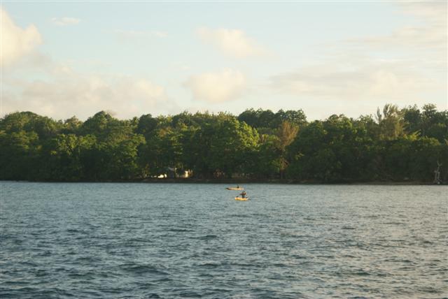 Approaching the bay the wind dropped as we slipped into the lee of the land under the cooling cloud cover overhead. The 33’ yacht Tomboy with Janice and Tom on board was already in the anchorage and Tom, rowing from the shore in his dinghy, helped David and Nathanial in their dugout canoe make Camomile fast to buoys fore and aft not far from the shore. Looking down into the 20 metre depth of crystal clear water I could clearly see the coral growth on the bottom and was glad not to have my anchor down there in it.