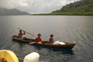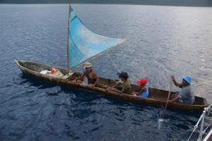 Our arrival seemed to be the signal for dugouts from miles around to come and introduce themselves and find out what we had on board to trade for their local produce. The dugouts here differ from the Polynesian outrigger style by being beamy enough to sit inside, being equipped with crude downwind sails similar to the Egyptian felucca and a pole for punting through shallow reefs. They are also monohull making them less stable but this didn’t stop them from standing up to fish with bows and arrows.
