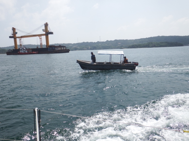 We were on the dock at 7.30 yesterday but there wasn’t any one around. Eventually Ravi, our agent, arrived at 8.15 with our clearance papers and to collect the money but we had to wait for the immigration officers to arrive to stamp our passports. At about 9.00 they turned up to stamp the 6 passports. Inspiration Lady, Tintin and Camomile were good to go. We weighed anchor at 11.00 and headed out to sea with Tintin, Inspiration Lady followed on about an hour later.