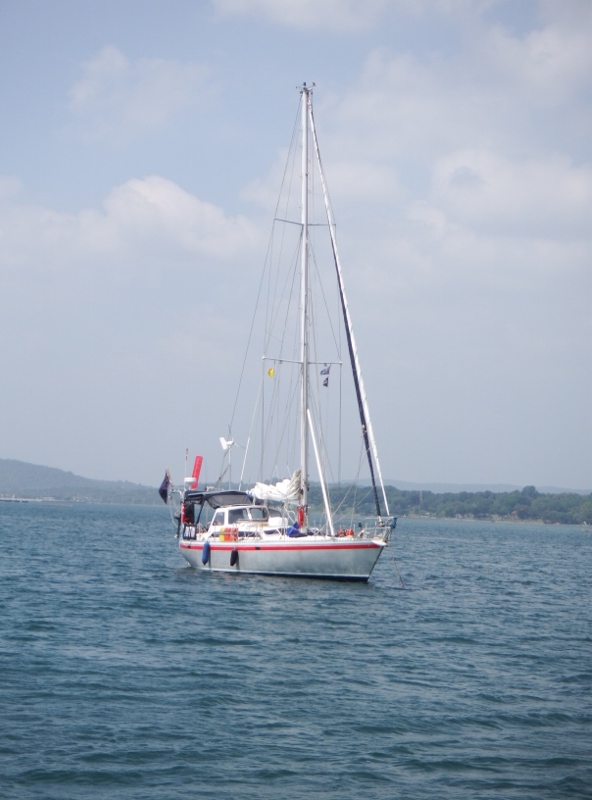 Bill spent all of the morning of the 5th June trying to replace the davit wire. It proved to be quite difficult but he managed it in the end. The anchor came up just after 1pm and finally it was goodbye to Kuah until the end of the year. We didn’t go far and anchored at Pulau Besar just 2 hours away. Sundowners on the deck again.