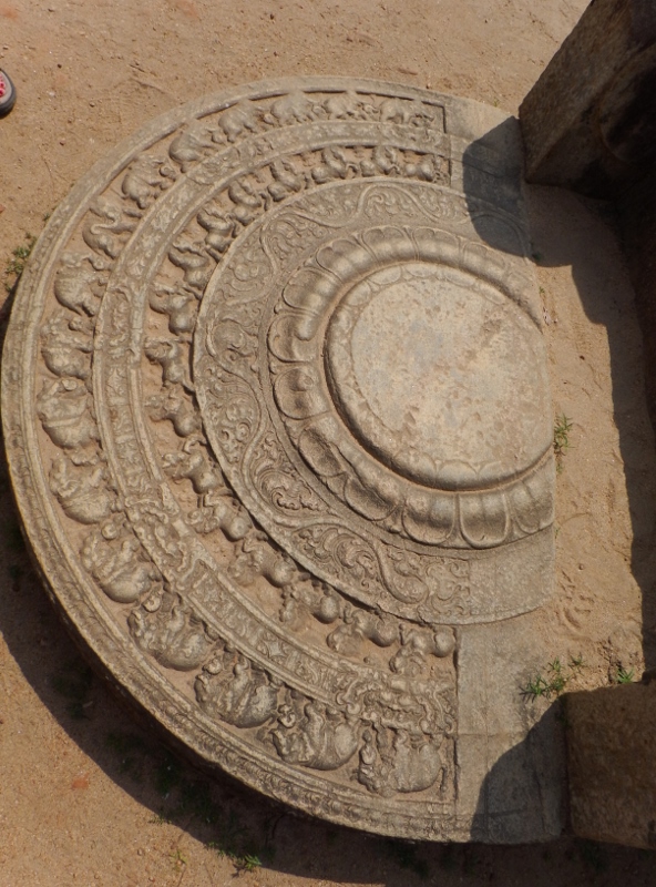 At the base of each of the guard stones was a moonstone . This is a ‘door step’ carved out of granite. It was amazing to us that we were allowed to walk on these fabulous carvings. Even though we had to take our shoes off at the entrance to the quadrangle bare feet will wear it away eventually.