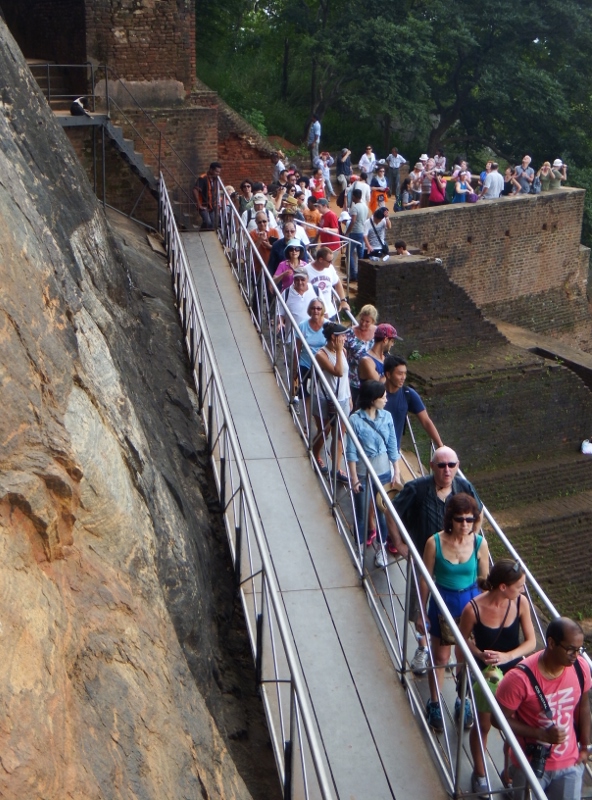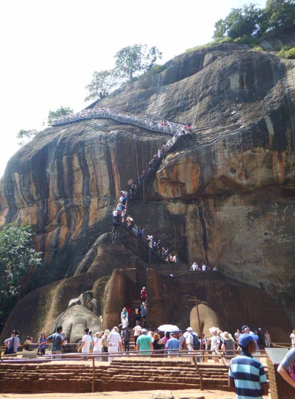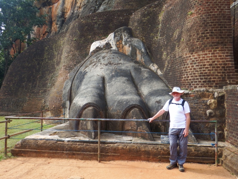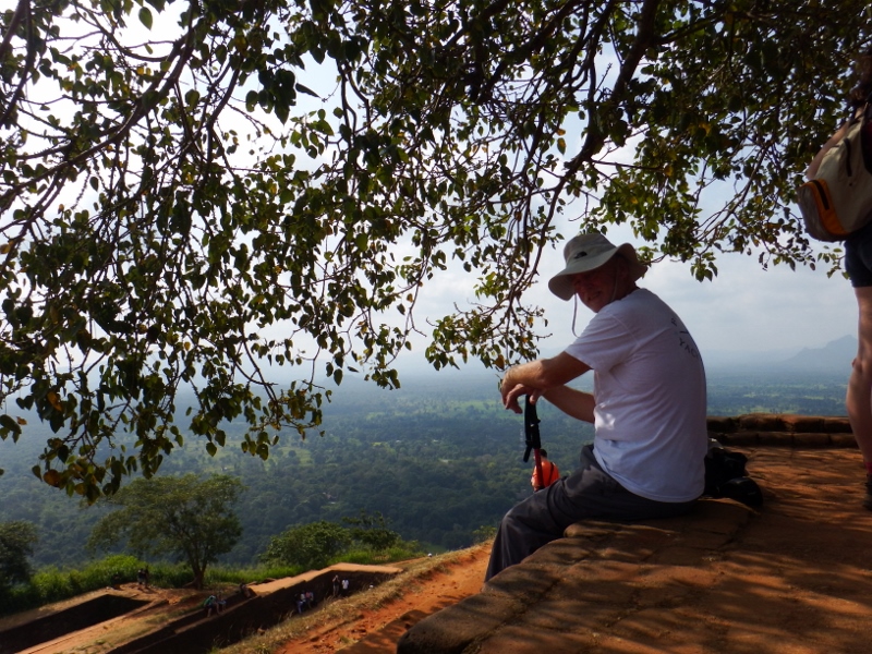 At the northern end of the rock, after more steps, the narrow path opens out onto a large platform from which the rock gained it’s name – the Lion rock. During the 1898 excavations two enormous lion paws were found. At one time a gigantic brick lion sat at this end of the rock and the final ascent to the top commenced with a stairway that led between the lion’s paws and into his mouth. It must have been quite spectacular. The 5th century lion has since disappeared, apart from his paws, and to reach the top now it was up more stairs, more narrow and more steep. These last set of steps were too much for Gary’s fear of heights and he stayed by the lion’s paws but the rest of us managed to get to the top. It was hard work. Once at the top we were told there were 1208 steps not that I was counting. The view from the top was spectacular, well worth the climb.