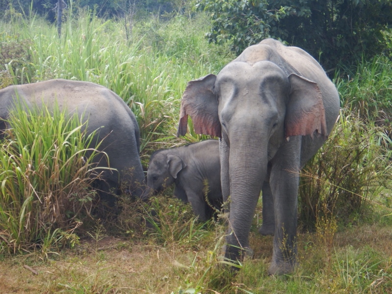We watched them walking around on one side of the road when suddenly one of the big females came charging out of the undergrowth towards us, quite scary. Our driver drove forward very quickly and she stopped. We can only assume she thought we were too close to her babies. After that they crossed to the other side of the track and were happy for us to watch. They were then joined by about 3 or 4 more also with babies. It was the most amazing experience there was just the six of us watching these wonderful sedate creatures going about their daily lives.