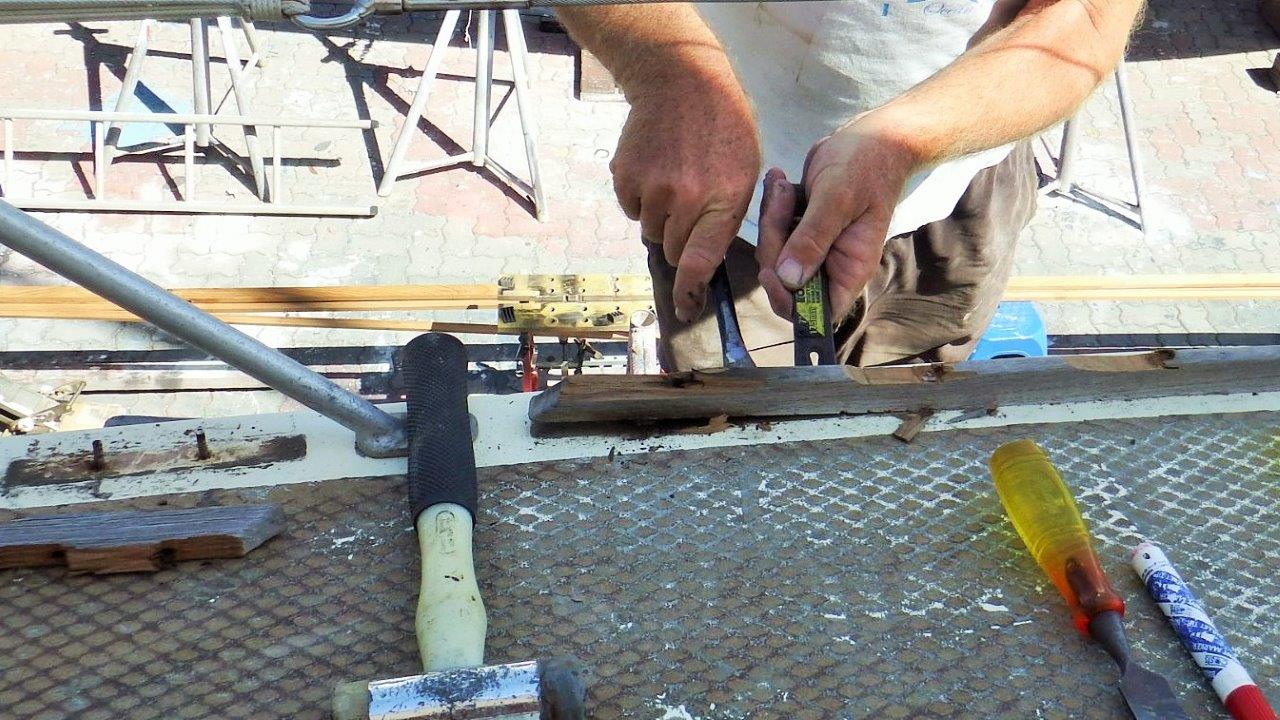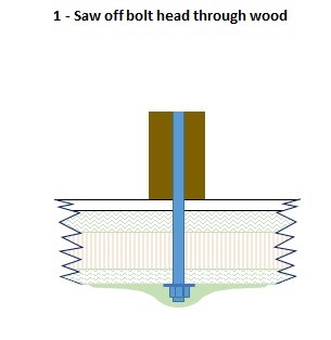 2) With a small jemmy & chisels into what was left of the adhesive under the wood the teak was lifted taking care not to damage the gelcoat. The bolt ends were then deburred and covered in short lengths of plastic tube to protect against injury.