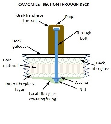 This section through the deck is fairly typical of the arrangement on our Sealord where the underside of the bolt is buried under soft trim and also fibreglass making a method of replacement from the outside only very attractive. I note many Westerlies are happily endowed with moulded in toe rails and handles mounted on plinths.