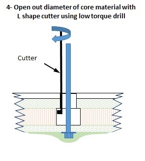 4) Remove the balsa core to a diameter 2-3mm larger than the counter-bore to ensure that the eventual compressive bolting load is transferred squarely to the outer skin thereby reducing the chance of the periphery of the counter-bore subsequently stress cracking from shear load and leaking. This would be achieved with an “L” cutter (much like an allen key with a shortened short end) in a low power/torque battery drill to avoid it snatching as you work your way around the stud. A specialised Dremmel tool might also be available to complete this task.