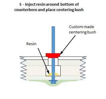 7) Once cured and with no leakage detected below the plug fixture would be removed while the counter-bore is potted (with perhaps a mineral filled resin) to within a few mm of deck level leaving a small recess as with the shallow counter-bore method.