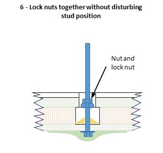 6) Fit square nuts or an upside down wing nut and hex nut to lock it to the shaft and tighten them together hard as deep as possible in the counter-bore such that they are immersed when potted with epoxy. As with the shallow counter-bore method this is to prevent the stud turning when the teak is fixed in place. Some trial and error would be needed here to determine the best “keyhole surgery” tools needed to lock these nuts together within the very confined amount of space.