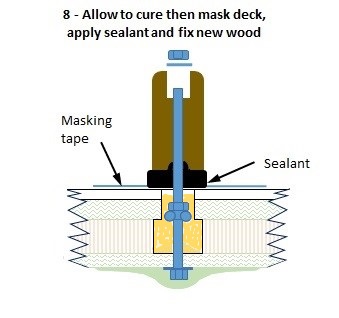 8&9) When fully cured the new teak work would be bedded onto masked mastic and squeezed out to ensure a good seal against the gelcoat and teak alike. When the mastic is almost cured it would be soft trimmed and the teak plugs bonded in with epoxy to protect the nut and stud.